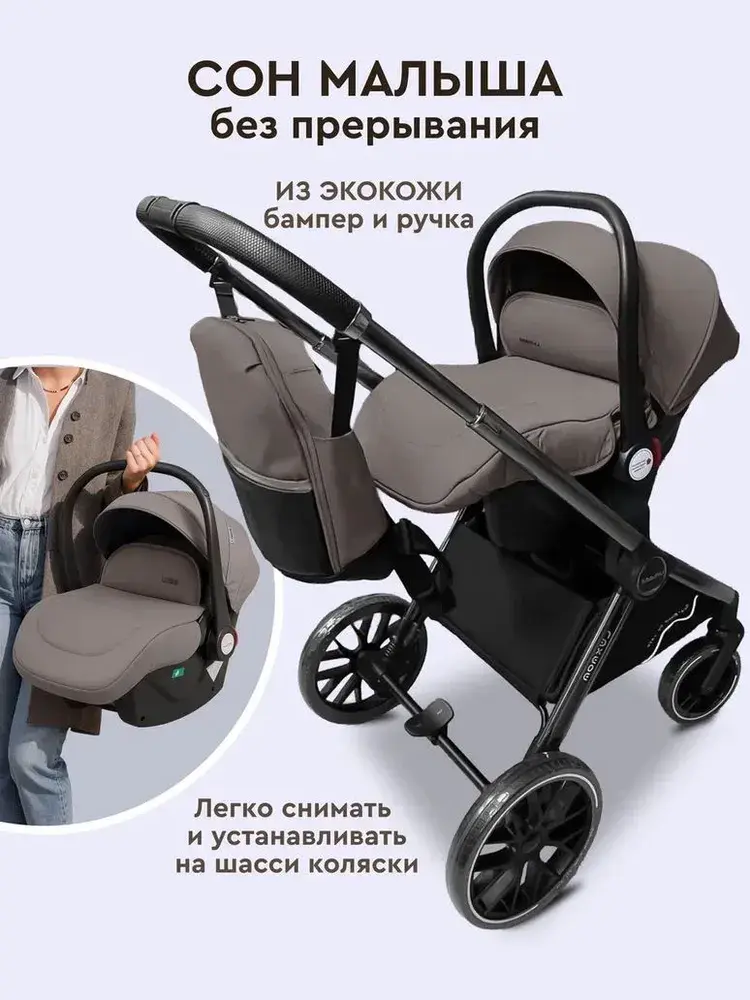 • Отделка ручки и бампера из экокожи придаёт коляске элегантный вид и удобный хват. Телескопическая ручка регулируется по высоте.