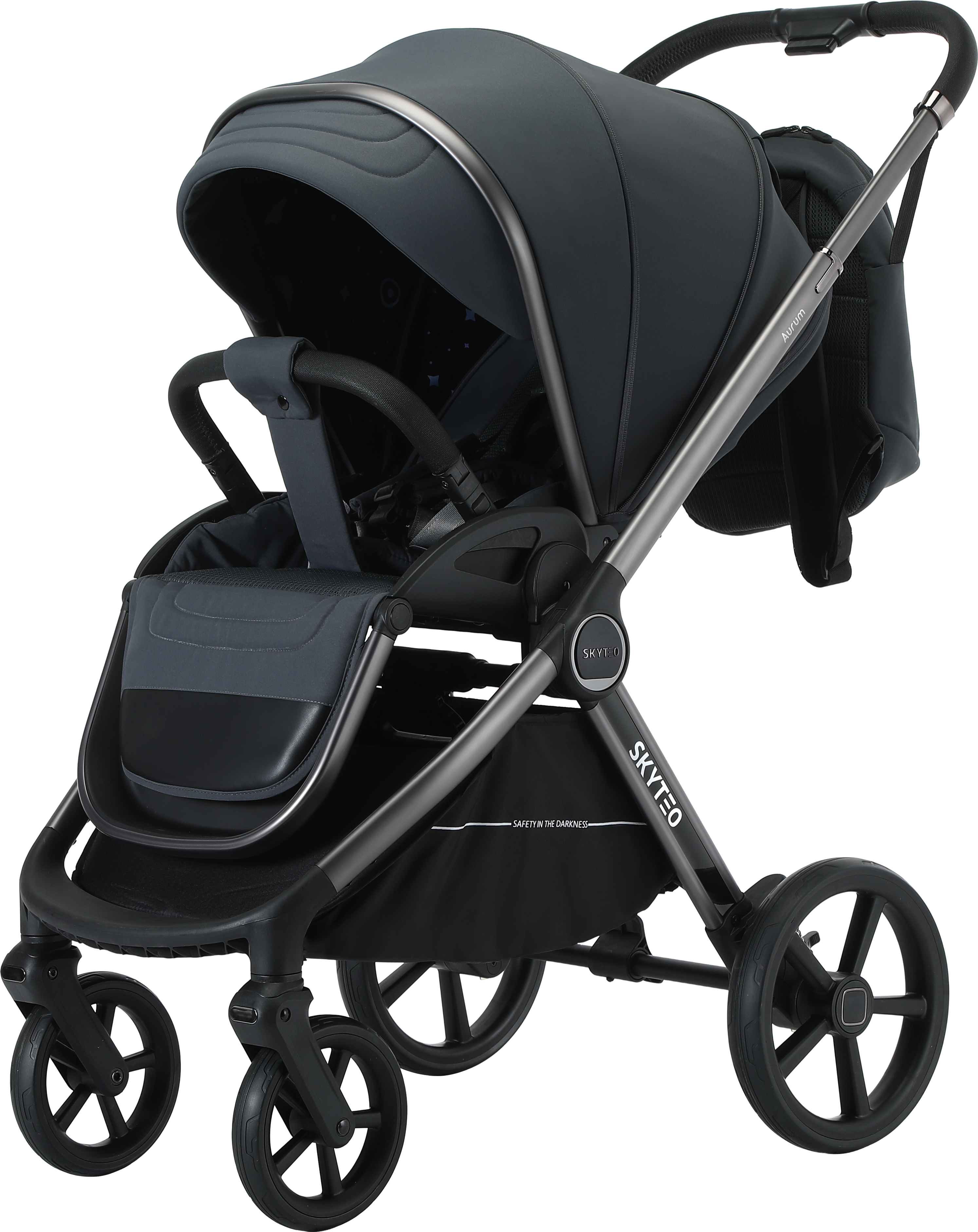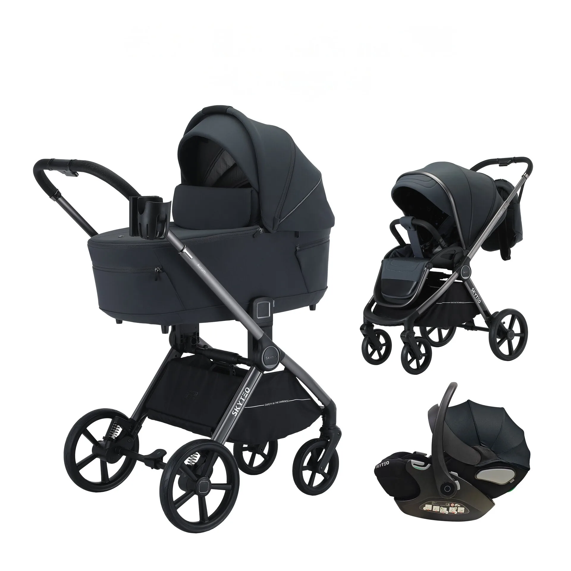 Skyteo Aurum 766 — трансформер 3 в 1 для малышей от рождения до 3-х лет включает люльку, прогулочное кресло и автомобильное сиденье. Вес модели варьируется от 12 до 13 кг в зависимости от конфигурации. Размеры в сложенном состоянии составляют 85x60x35 см. Люлька оснащена жёстким основанием, глубокими бортиками, регулировкой капюшона и ортопедическим матрасиком. Прогулочная часть реверсивная, имеет регулятор наклона спинки, пятиточечную систему крепления шасси выполнено из алюминия, колеса прорезиненные, передняя пара поворачивается и фиксируется.