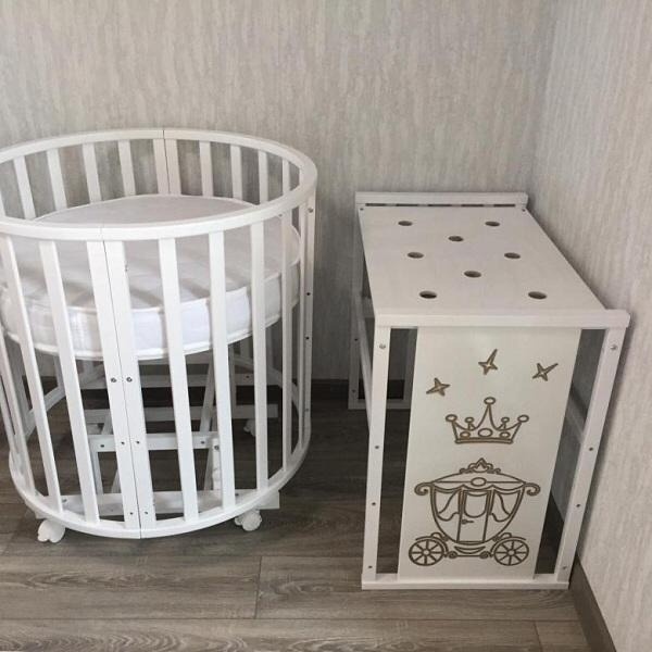 Модель адаптируется под растущего ребенка и имеет шесть вариантов трансформации: круглая кровать, овальная кровать, манеж, два стульчика, столик, диванчик