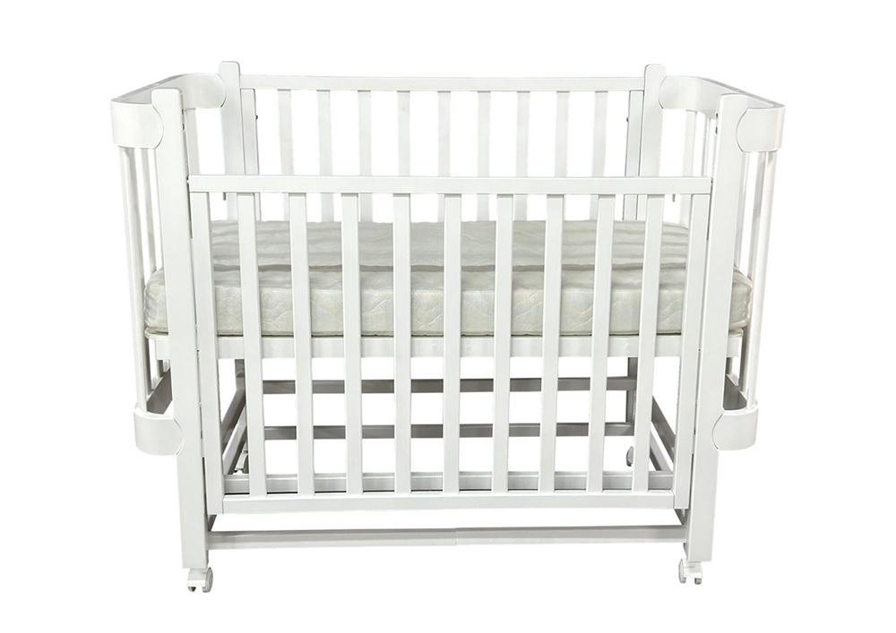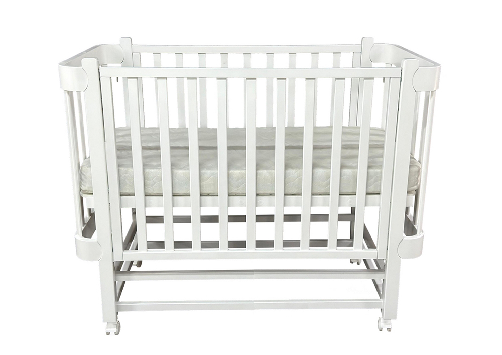 Кроватка Solnyshko 2 - укомплектована продольным маятниковым механизмом и колесами. Подвижное переднее ограждение с удобным механизмом фиксации в двух положениях по высоте обеспечивает свободный доступ к малышу. Кровать выполнена из экологически чистых материалов, которые абсолютно безопасны для ребенка